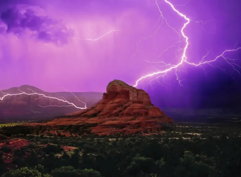 Över ett landskap av röda klippor och låg vegetation sprider sig ett oväder. Blixtar slår ner med full kraft och himlen är upplyst i lila toner.