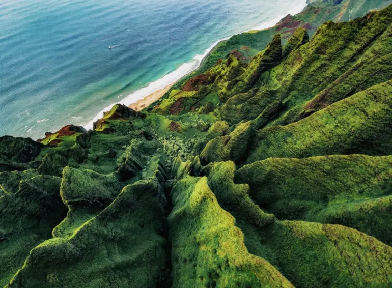 Ett mäktigt grönt klipplandskap med knivskarpa klippformationer böljar ned mot en liten strand. Vita vågor sköljer in över sanden och mot horisonten sträcker sig vattnet från grönt till mörkblått.