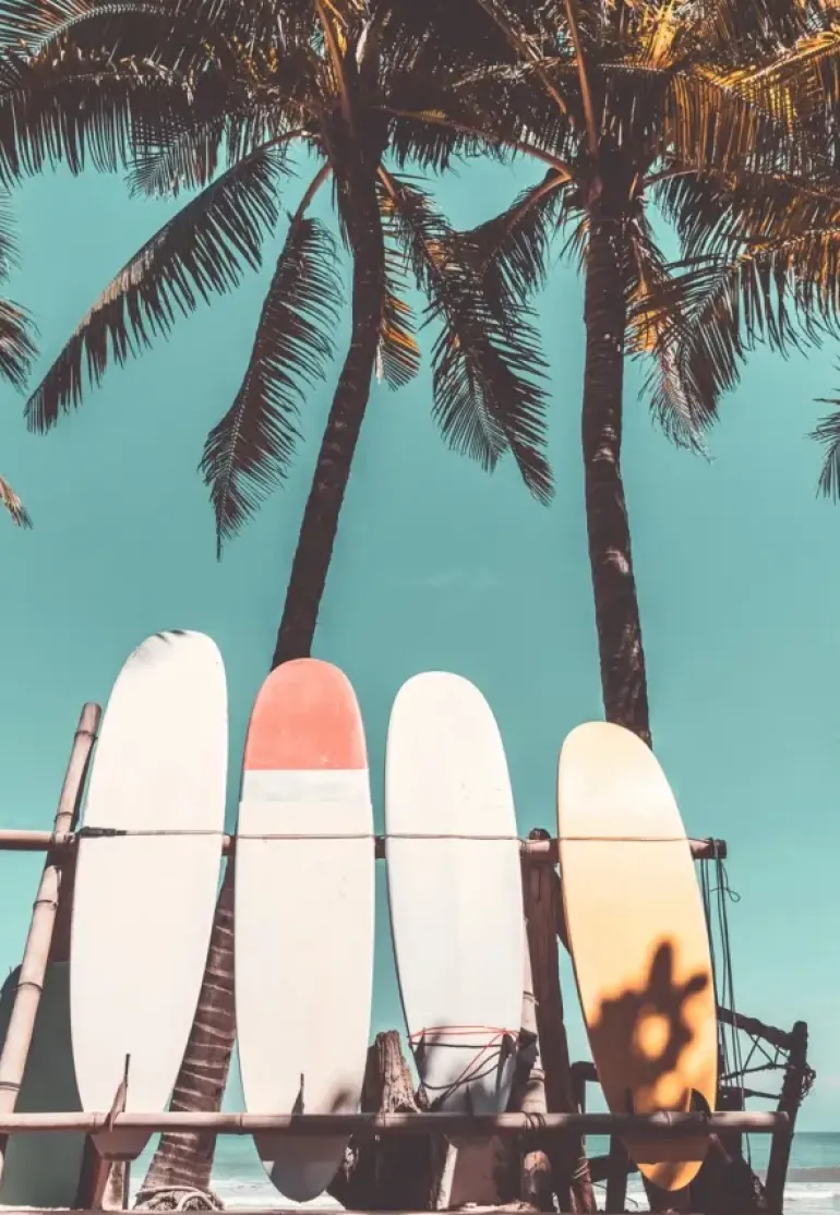 Fem surfingbrädor står uppställda på stranden i skuggan av en palm.