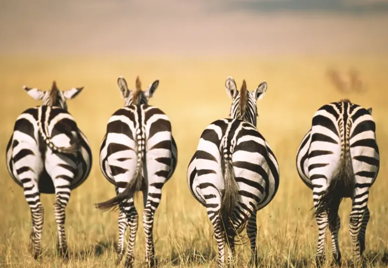 Med stolt svansföring är fyra zebror på väg bort på savannen. I bakgrunden skymtar vi det torra gräset och lite blå himmel.
