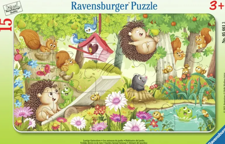 Skogens alla djur har samlats vid dammen för att leka och bada. Igelkottarna har byggt en hoppbräda, se upp här kommer ett jätteplask! Rampussel med gulligt och detaljrikt motiv på 15 bitar.