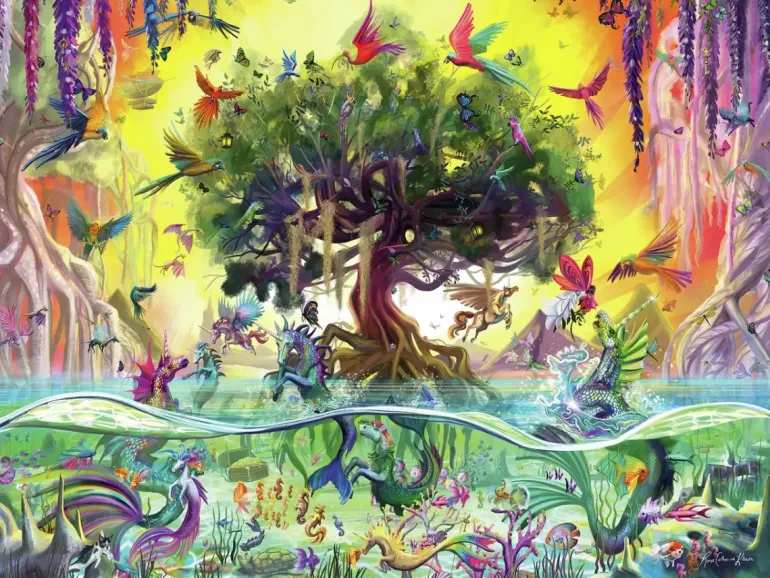 I ett magiskt träsk, med kristallklart vatten och vackra träd, lever fantastiska djur och sagoväsen sida vid sida. Här finns enhörningar som flyger men också havsenhörningar som lever i havet bland sjöhästar, fiskar och andra fantasiväsen. Ett motiv fullt av färg och liv!