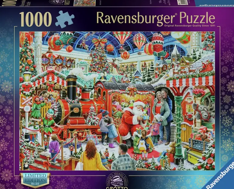 I en väldekorerad butik har tomten tagit plats för att dela ut Julklappar till alla snälla barn. Man har ställt upp ett fint rött lok fullt av julklappar och ett litet hus där renar sticker ut sina huvuden genom fönstret. Taket är av glas och mot den stjärnklara himlen hänger luftballonger, stora julkulor och julstrumpor. Ett härligt julmotiv fullt av detaljer i rött och grönt!