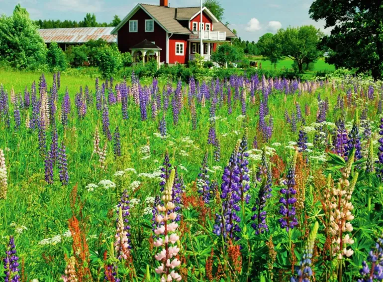 På en gård någon stans i Sverige finns en klassisk röd villa med vita knutar och i bakgrunden skymtar vi ladugården och några kor som betar förnöjt. Framför huset breder sig en stor äng där lupiner och ängsblommor blommar för fullt i det höga gräset.