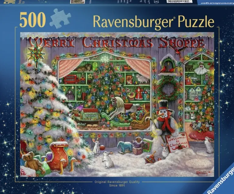 Det är Jul och vi står utanför en välfylld leksaksbutik med ett inbjudande skyltfönster. Utanför ligger snön vit och bland leksaker, Julgranar och snögubbar hoppar små vita kaniner. Ett pussel som sprider både Julglädje och förväntningar inför Julafton, vad önskar du dig?