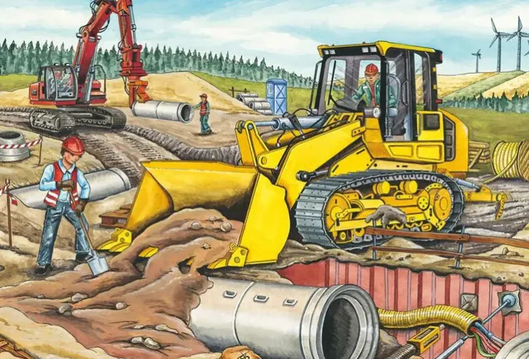 Tre pussel på 48 bitar vardera, med olika motiv av byggarbetsplatser och tunga fordon.