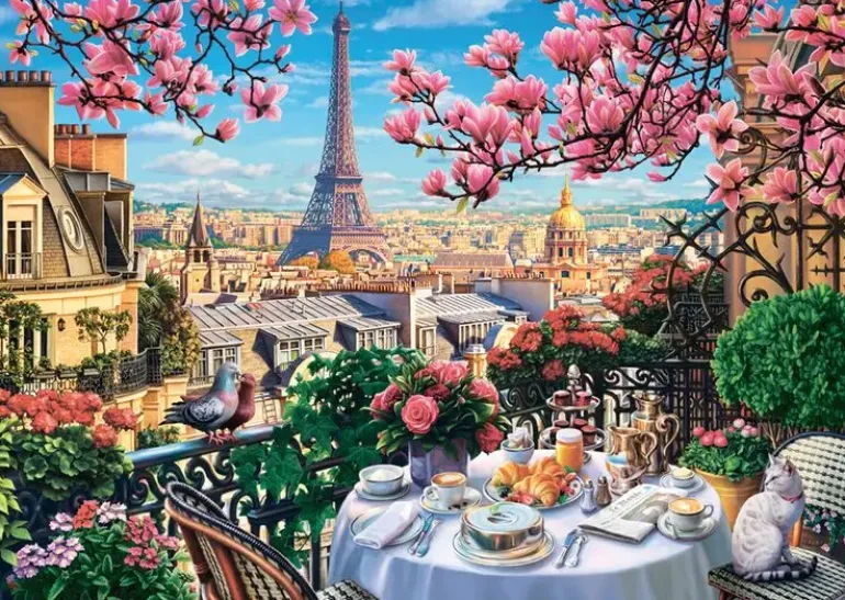 På en balkong i Paris är bordet dukat med kaffe och croissanter. En katt har tagit plats på en av trädgårdsstolarna och tittar intresserat på två turturduvor som slagit sig ned på balkongräcket. Här finns mängder av krukor och balkonglådor med vackra blommor och en en magnolia står i full blom. Vyn är hisnande vacker med utsikt över staden och Eiffeltornet mot en klarblå himmel. Bon appétit!