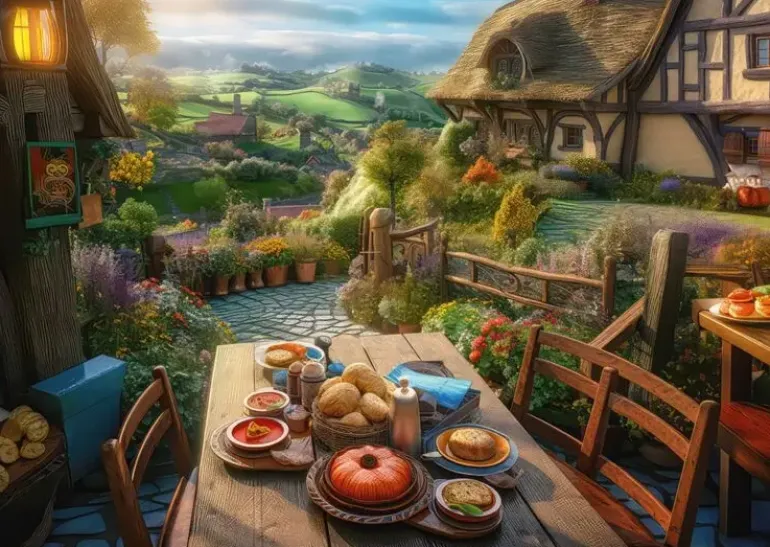 En utsökt frukost med fint väder och vacker utsikt över naturen på landsbygden. Vad mer kan man begära? En perfekt morgon!