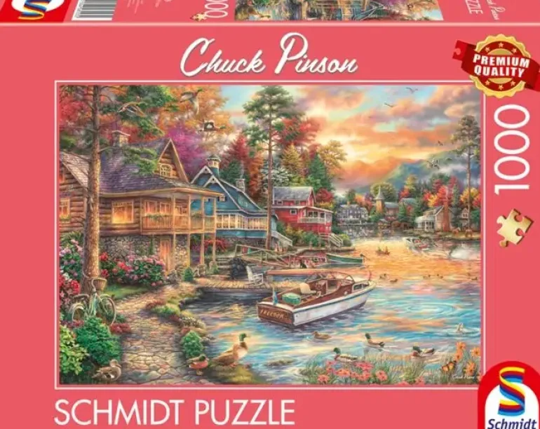 Solen är på väg ner över en sommaridyll med vackra stugor belägna precis vid vattnet. Här sträcker bryggor ut sig i aftonsolen och både djur och människor passar på att njuta av solens sista strålar och det lugna vattnet på sjön. Ett naturskönt motiv med många vackra detaljer skapat av konstnären Chuck Pinson.