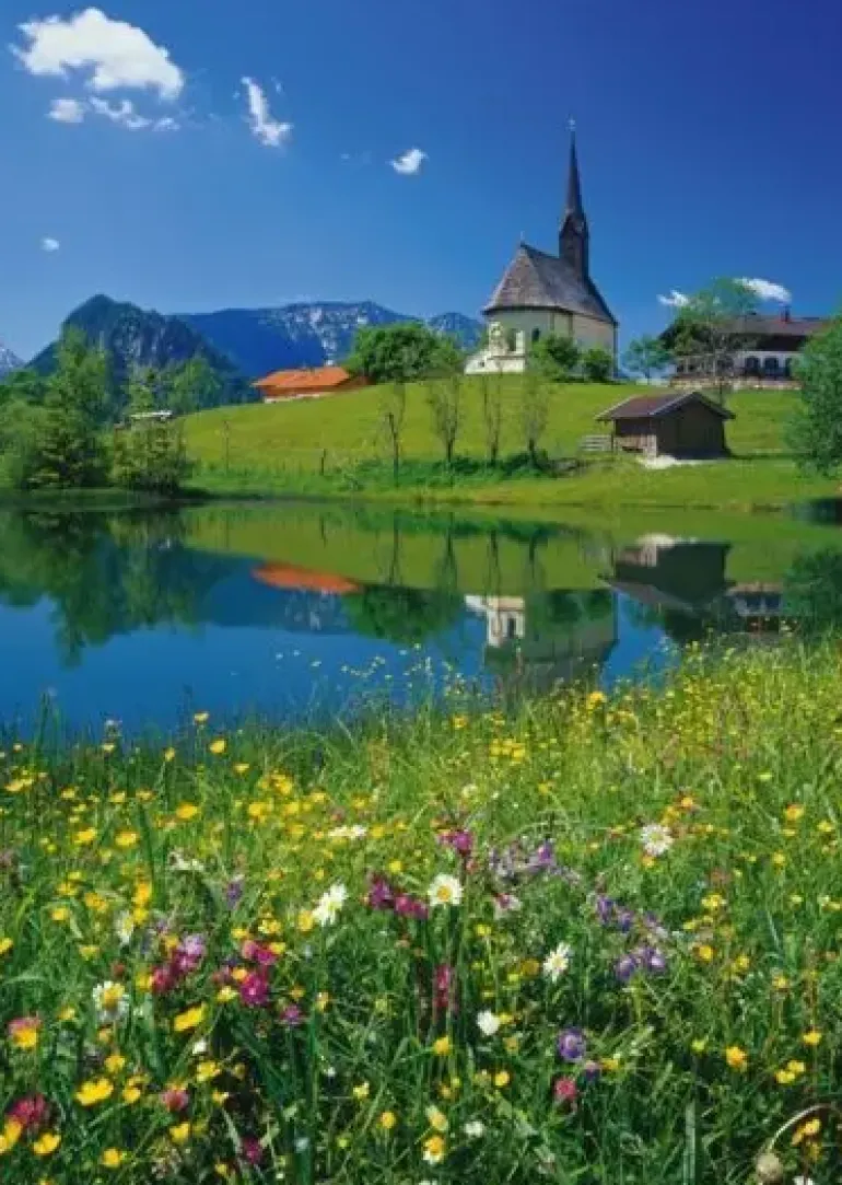 I kommunen Inzell i Bayern, Tyskland ligger ligger en vit kyrka vackert belägen vid en sjö. Det är sommar, himlen är klarblå, gräset är grönt och ängsblommorna blommar. I bakgrunden skymtar man alpernas bergstoppar.