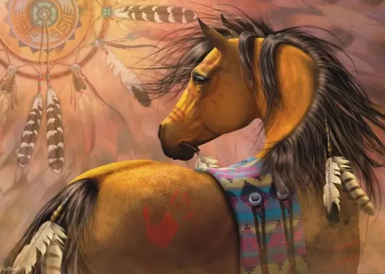 Fantasymotiv av illustratören Laurie Prindle. En vacker häst i guldskimrande päls och brun man som blåser i vinden. Hästen är dekorerad med fjädrar och ett rött handavtryck, i bakgrunden syns en drömfångare.