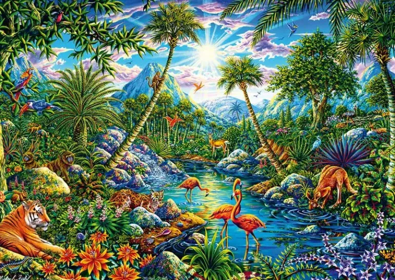I det här pusslet befinner vi oss mitt i djungeln på en grön paradisö. Djungeln är tät och frodigt grön, överallt syns mängder av djur som flockats kring en turkosblå bäck. I bakgrunden syns höga berg och en strålande sol i motivets centrum, omgiven av moln i rosa och lila. Ett pussel som säkerligen är väldigt roligt att lägga med många spännande små djur och insekter att upptäcka bland pusselbitarna.