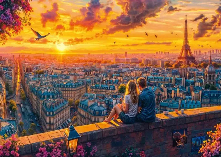 Från en vacker utsiktsplats har man utsikt över hela Paris. Här har kärlekspar samlats för en romantisk stund, och solen hjälper verkligen romantiken på traven ikväll genom att hölja dem i ett magnifikt sken av guld.