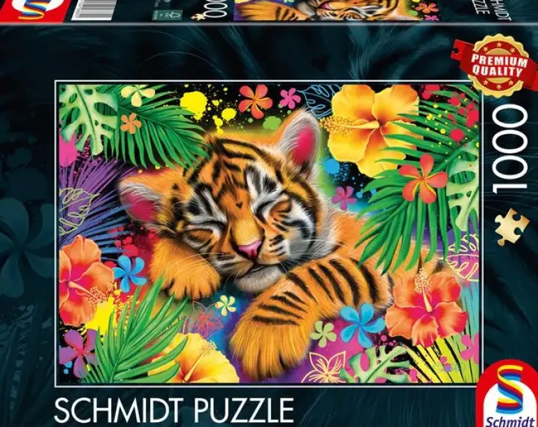 En otroligt söt tigerunge ligger och sover bland gröna blad och färgglada blommor. Ett oemotståndligt sött pusselmotiv som säkert kan vara utmanande att pussla ihop, med många snarlika pusselpartier i form av randig tigerpäls och gröna bladverk.