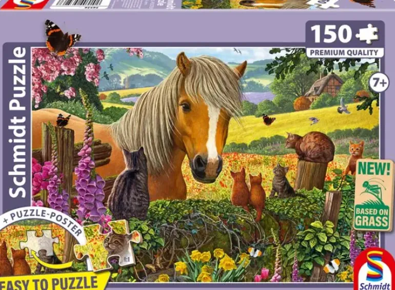 På en vacker äng, omgiven av gröna träd och med en utsikt över böljande kullar och en stor sjö, bor en ståtlig häst. Den har gått fram för att träffa sina kattkompisar som sitter på staketet. Ett gulligt pusselmotiv för dig som tycker om djur och natur!