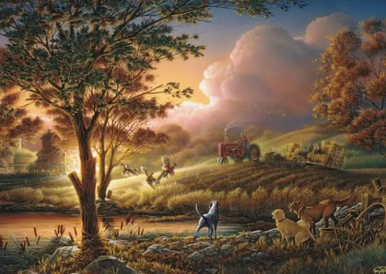 Det är skördetid och en bonde håller på att bärga hö. Omkring honom flyger höstens flyttfåglar och hans hundar har precis lyckats skrämma fram en flock fasaner. I bakgrunden skymtar en stor gård mot en strålande solnedgång eller soluppgång. Vilket det är ligger i betraktarens ögon!