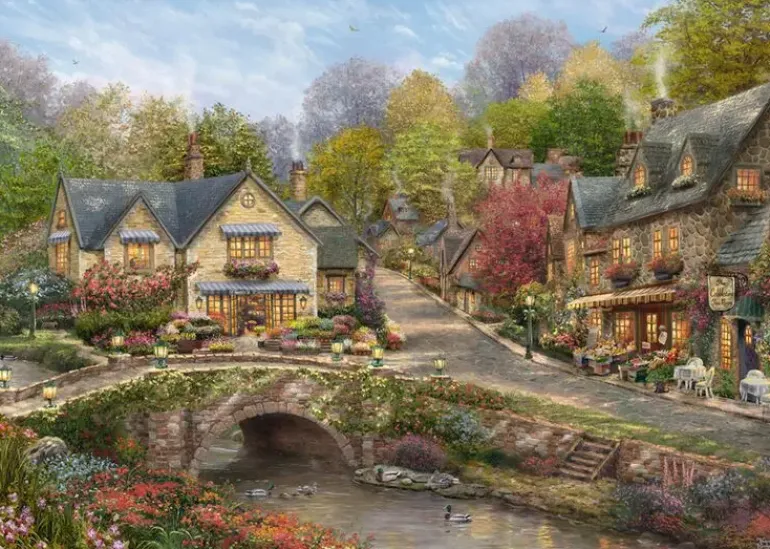 Visst bli man sugen på att ta sig en promenad genom den vackra byn och den rogivande naturen som omger den! Ett idylliskt mästerverk av de skickliga illustratörerna på Kinkade Studios.