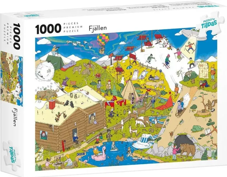 Välkommen till en härligt aktiv dag i fjällen! Här flockas fjällturisterna för att åka skidor och njuta av naturen och dess rika djurliv. Ett detaljrikt humormotiv fullt av liv och rörelse tecknat av illustrerat Joel Folkesson.