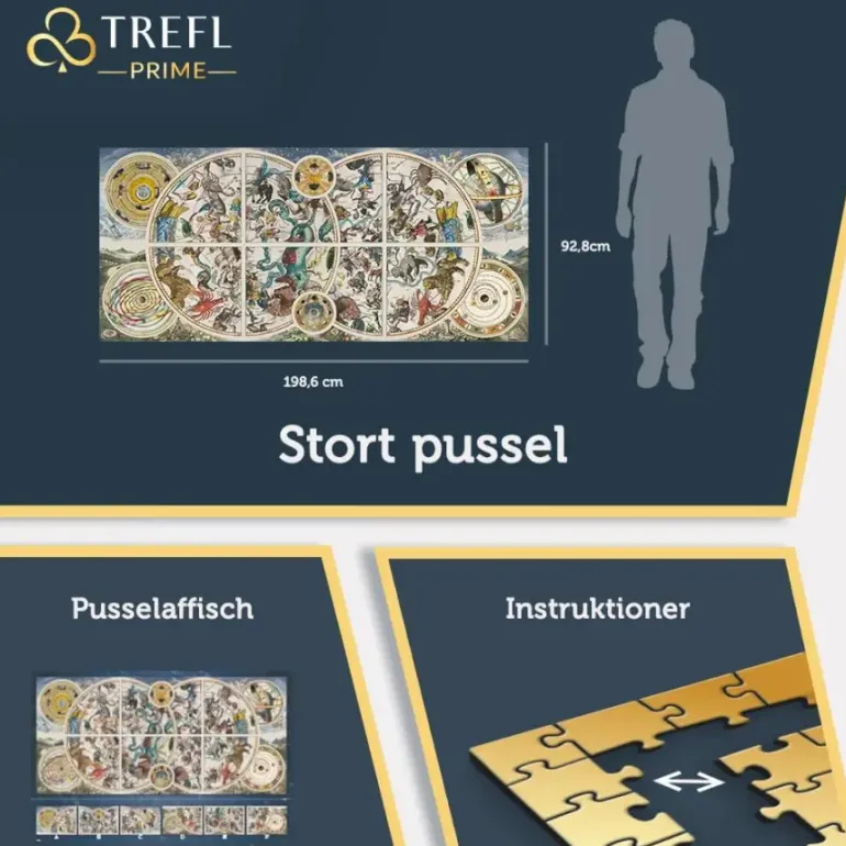 Det här mäktiga pusslet är på hela 9000 bitar och blir över en meter brett, så det gäller att ha både plats där hemma och ett stort uns pusseltålamod. I pusselkartongen får du 6 påsar (märkta A-F) med 1500-bitar i varje påse. Varje pussel kan sättas ihop för sig för att slutligen monteras ihop till ett stort pusselmotiv. Instruktioner och en poster av motivet ingår också.
