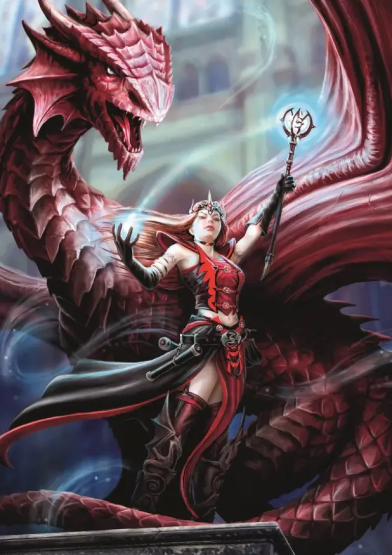 En kvinna i rött står i en mäktig pose, redo med sin magiska stav som strålar med ett elektriskt ljussken. Bakom henne har hon sin följeslagare, den stora skräckinjagande röda draken!