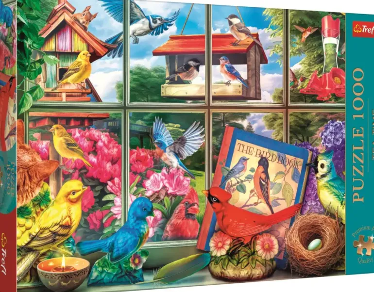 I det här trädgårdsinspirerade trädgårdsmotivet får vi agera fågelskådare en solig försommardag. Vi blickar ut genom ett spröjsat fönster och ser trädgården breda ut sig, här finns välbesökta fågelbord och en fågelholk i glada färger.