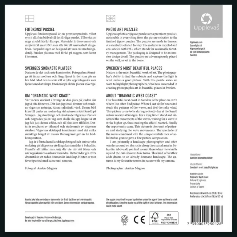 Upplevas vill i den här pusselserien höja fotografer som skapat fotokonst av olika platser i det vackra svenska landskapet. Speciellt fokus ligger på den naturliga belysningen och rätt motiv. Affisch medföljer.