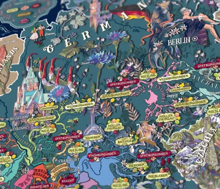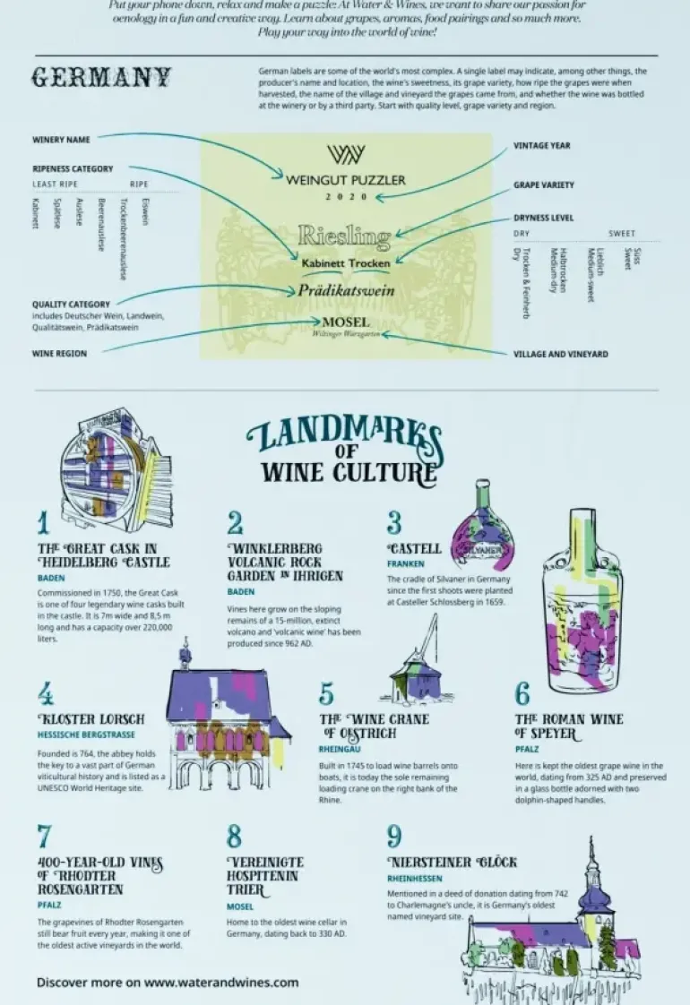 Lär dig om Tysklands viner och vinregioner samtidigt som du lägger ett vackert pussel! I pusselkartongen ingår även en poster.