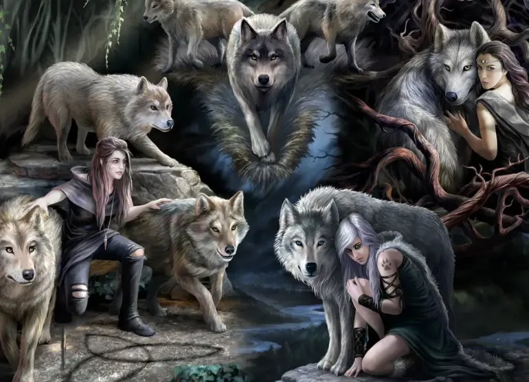 I detta fantasymotiv av Anne Stokes porträtteras tre kvinnor tillsammans med en grupp vargar. Det ser ut som att de är i skogen och att kvinnorna skyddar vargarna mot något.