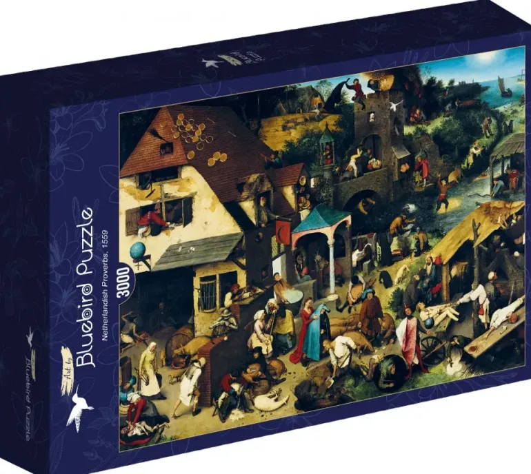 Det här motivet utspelar sig på landsbygden och är fullt av människor som sysselsätter sig med olika aktiviteter. I motivet har Breugel symboliserat en mängd nederländska ordspråk och idiom. Kanske kan du roa dig med att gissa vilka ordspråk konstnären har syftat på medan du lägger detta detaljrika pussel!