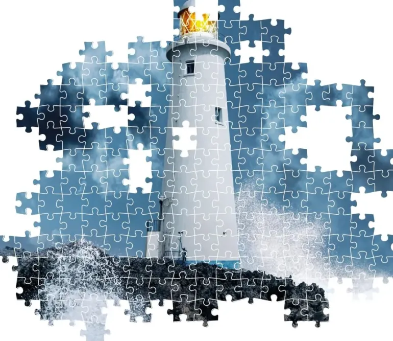 En vit fyr sträcker sig mot en mörkblå himmel och skummande vågor slår mot klipporna den står på, blåser det upp till storm mån tro? Tur då att dess varma sken kan guida alla säkert till havs.