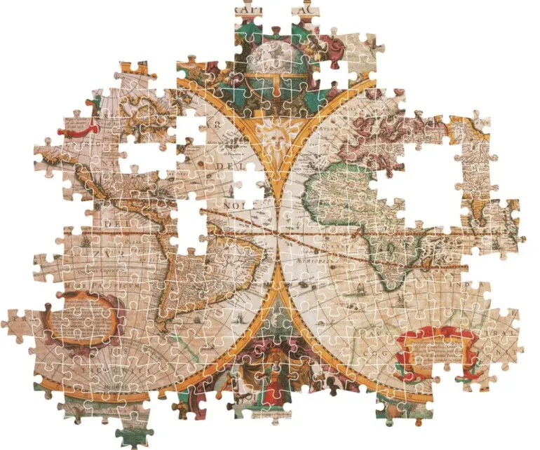 En antik världskarta omgiven av tidsenliga konstverk.