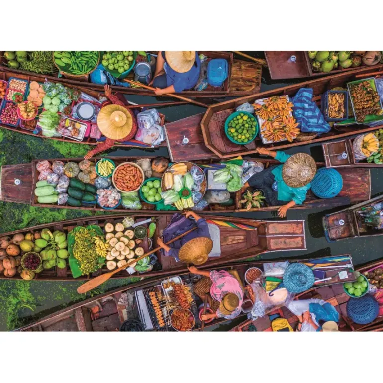 En flytande frukt- och grönsaksmarknad i Thailand ur fågelperspektiv. Här ligger de avlånga båtarna på rad, fulla av färsk frukt och nyskördade grönsaker. Försäljarna bär stråhattar som skyddar mot solen och färggranna kläder som matchar fint mot varornas färgprakt och båtarna i trä.
