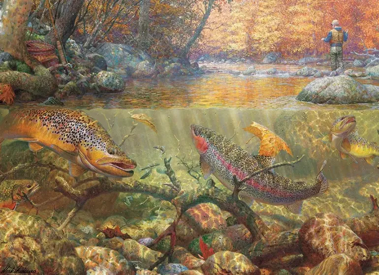 En fiskares drömdag! Det är höst, skogen är tyst och vattnet är kav lugnt. Under vattenytan simmar fiskar som skulle passa perfekt till middag! Vem hejar du på, fiskarna eller fiskaren?