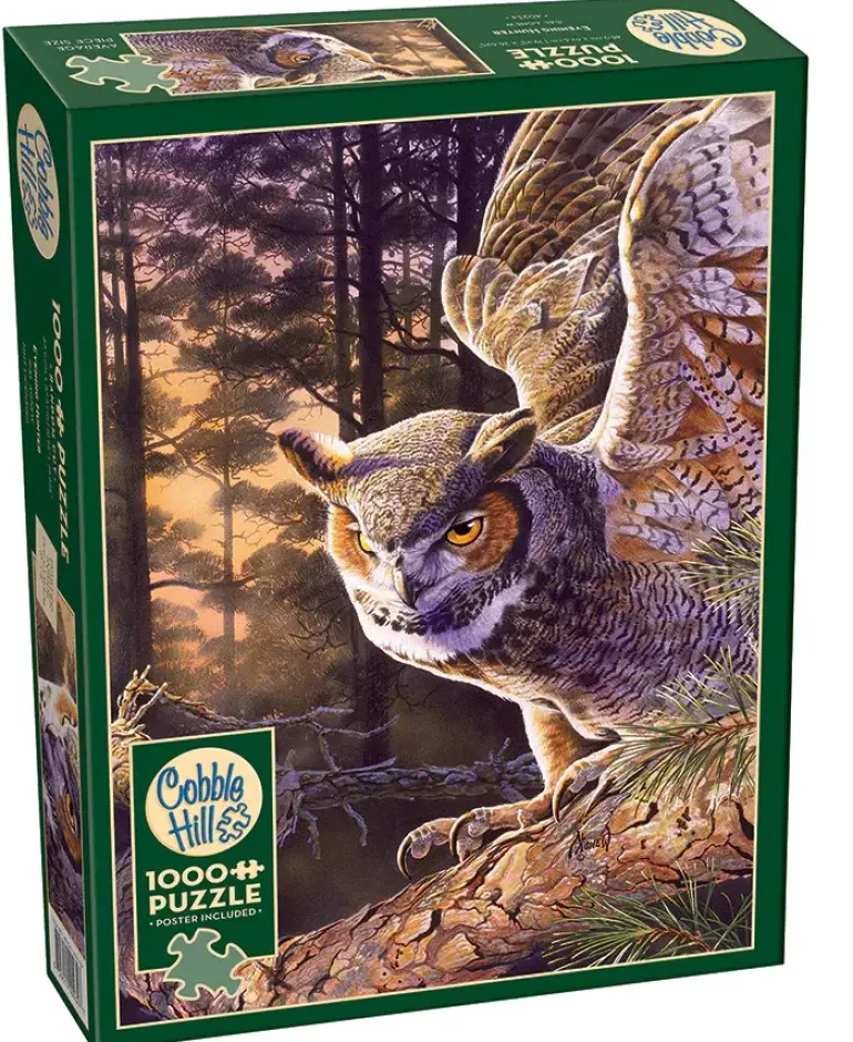 En uggla sitter högt upp på en tallgren i skogen, i bakgrunden syns trädtoppar och ett gyllene sken från en sol på väg ned. Ugglan är i färd med att spänna ut vingarna, redo att flyga mot något spännande på marken som fångat dess intensiva blick. Med sina natursköna toner i brunt erbjuder det här motivet en lite mer utmanande pusselupplevelse.