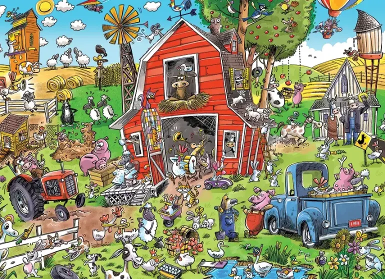 Den här lantliga gården är allt annat än en vilsam idyll. Här är det fullt hålligång där gårdens alla djur leker och arbetar tillsammans en solig sommardag. Motivet är fullt av roliga detaljer och passar hela familjen.