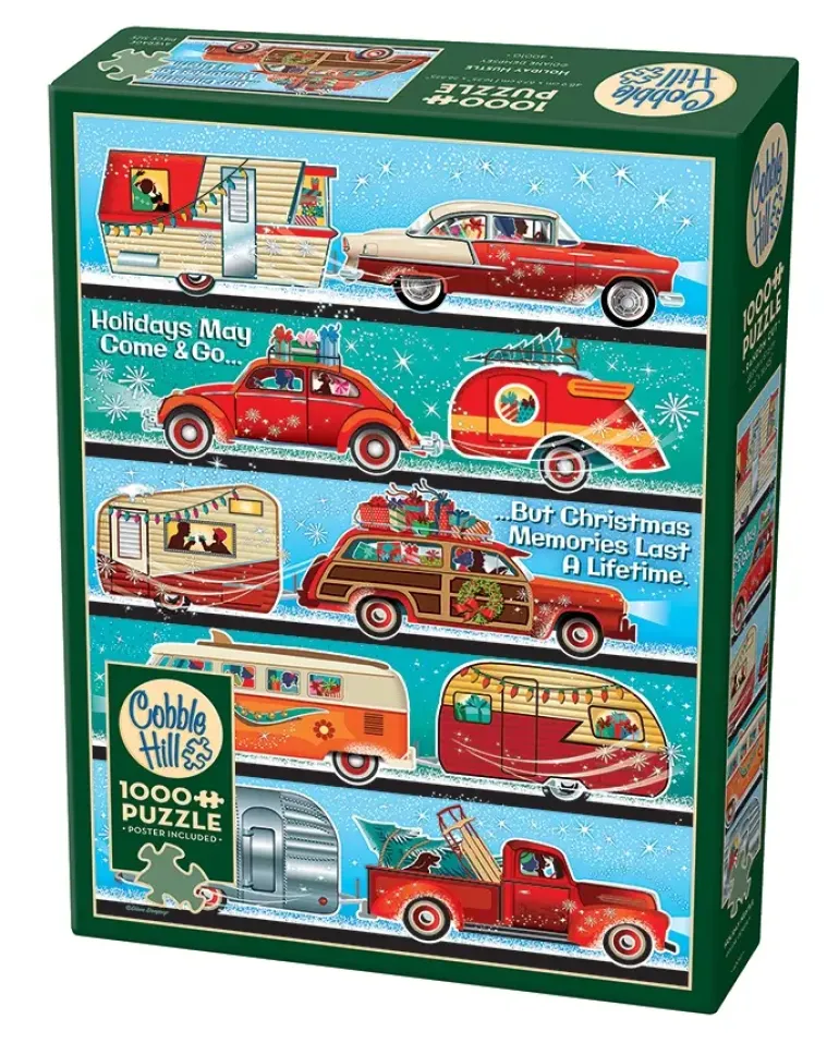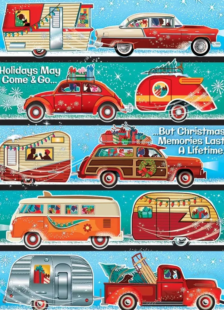 I det här motivet är de röda vintagefordonen packade för julledigheten, och de flyger fram längs de snögnistrande vägarna för att alla ska hinna fram i tid till festligheterna. Folk har med sig allt som behövs för att skapa en riktig julstämning. Julgranar, husdjur, julbelysning och julklappar trängs med de förväntansfulla resenärerna.