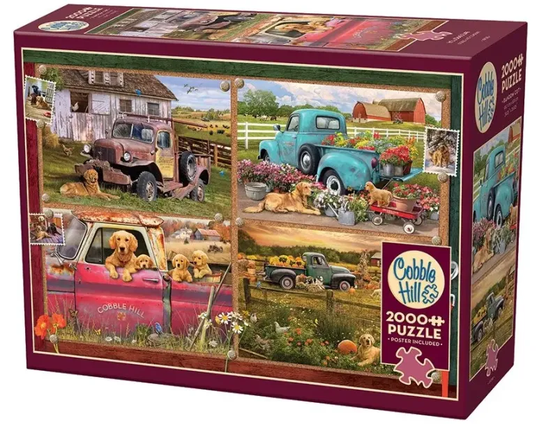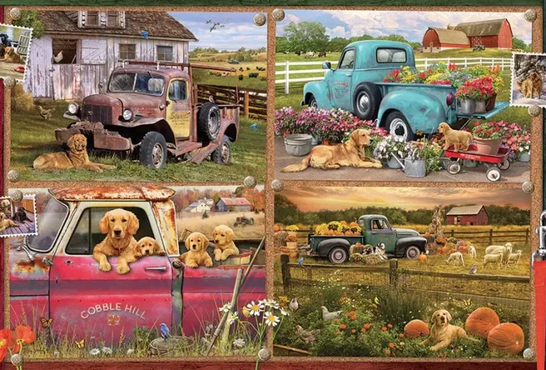 Ett kollage av fyra charmiga landskapsmotiv med hundar i fokus. I motiven syns Golden retrievrar i lantliga miljöer med gröna landskap i bakgrunden. Alla befinner sig även vid ”Pickups” av gamla modeller och här och var syns andra lantgårdsdjur som skapar liv i de idylliska miljöerna.