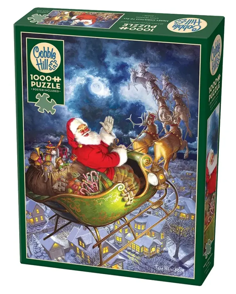 Tomten flyger med sin släde högt upp i den djupblå julnatten, och den stora fullmånen sprider ett starkt ljus, perfekt för att renarna ska kunna guida honom rätt. Släden är fullpackad av leksaker och under honom syns de snötäckta hustaken. Tomten vänder sig mot pusslaren och hälsar med ett glatt ho, ho, innan han styr vidare mot nästa leverans.