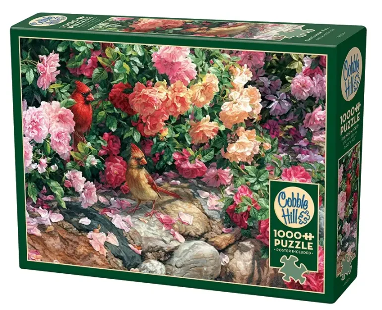 En stenmur pryds av mängder av blommor i röda, rosa och lila toner. I motivet finns också två nyfikna kardinaler som tycks ha fått ögonen på något spännande utanför motivet. Ett pussel som kan vara en utmaning med många snarlika bitar men som säkerligen blir strålande vackert när det är klart.
