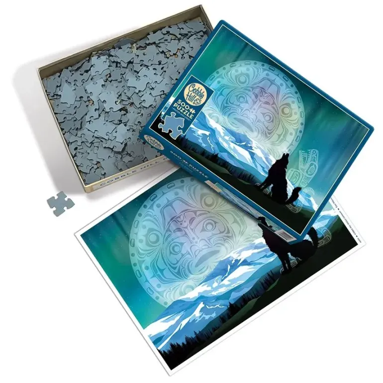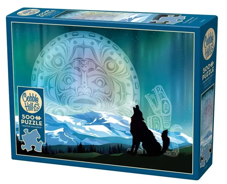 En svart vargsiluett ylar mot en stjärnbeströdd natthimmel fyllt av norrsken. I bakgrunden syns symboler mot himlavalvet, snöbeklädda fjälltoppar och skogen vid foten av bergen.