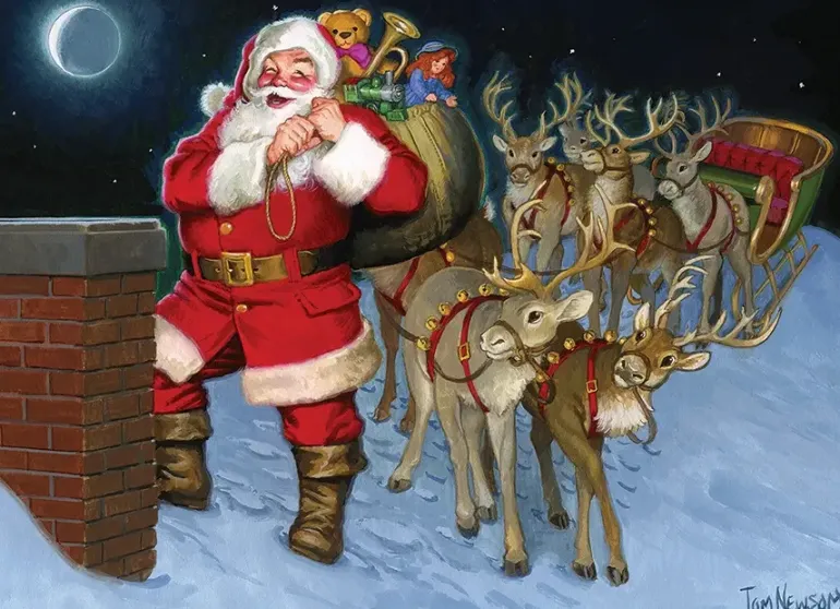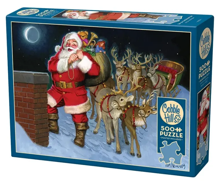 Jultomten och hans trogna renar har landat på ett av många hustak som ska besökas denna stjärnklara julaftonsnatt. Tomten står glatt redo för att ta sig ner genom skorstenen med sin säck full av julklappar. Det snöiga taket är inget bekymmer för hans renar som tålmodigt väntar under den månbelysta himlen.