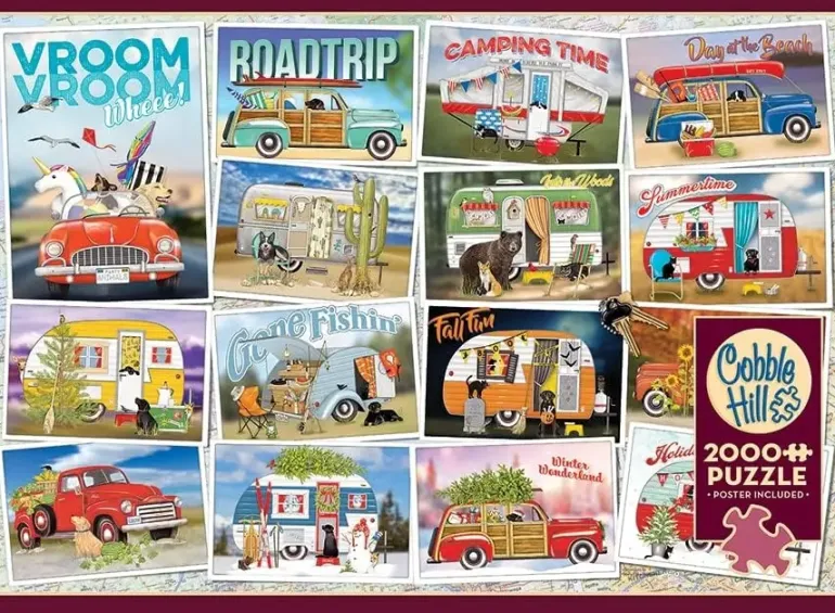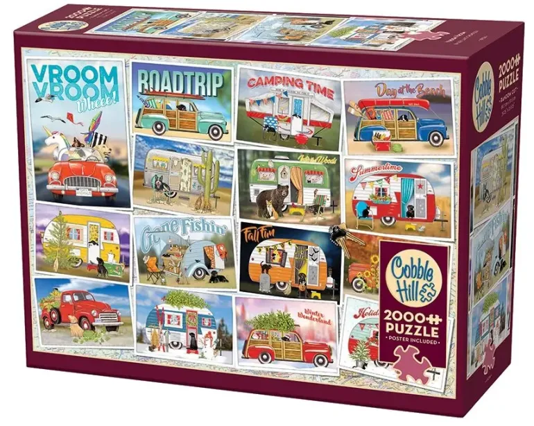 Ett detaljrikt kollage av charmiga vykort i retrostil. Vykorten är skickade från olika bilsemestrar under året, från ljuv vår till Vinter och Juletid.