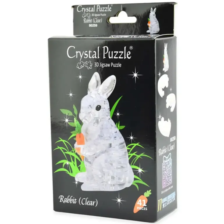 Ett 3D-Kristallpussel i form av en kanin som håller i en morot.