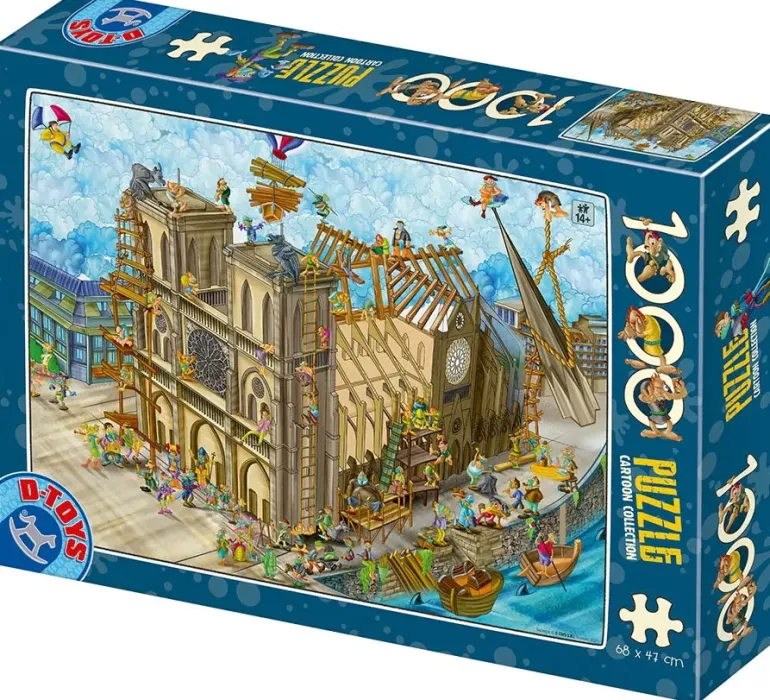 Tecknat humormotiv där fransmännen är i full gång med att bygga sin berömda kyrka Notre-Dame. Det är en molnig dag full av aktivitet både vid byggarbetsplatsen och på gatorna runtomkring. Dessutom verkar en fallskärmsklubb vara i farten just idag med fallskärmar i franska flaggans färger.