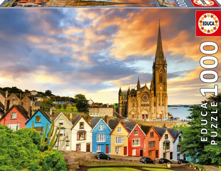 Cobh Cathedral är byggt nära Cork harbour som syns till höger i motivet av detta pussel. Ett gäng små och färgglada gulliga hus syns även längst fram!