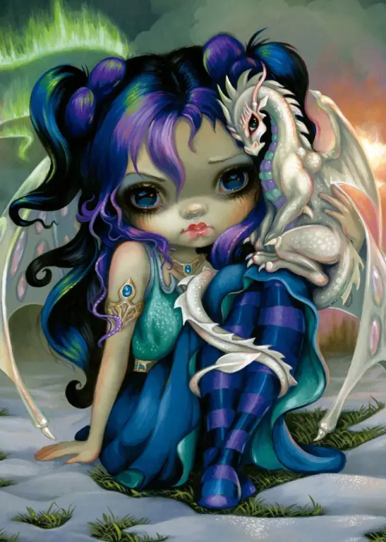 En flicka med mörkt hår och lila hårslingor sitter på en liten gräsplätt omgiven av snö. Hon är klädd i en klänning och strumpbyxor i turkosa och lila toner och bär vackra smycken kring sin överarm och hals. På hennes axel sitter en vit drake som breder ut sina skyddande vingar kring henens rygg. I himlen tornar mörka moln upp sig och ett norrsken slingrar sig fram i nattmörkret.