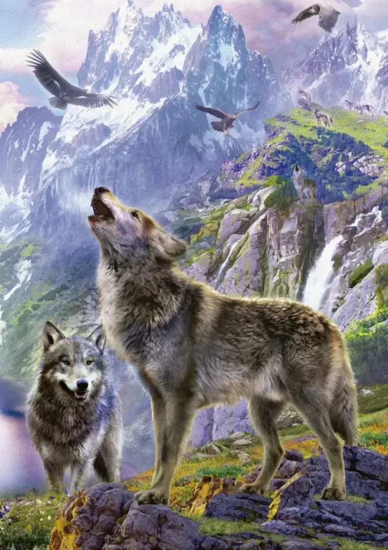 En flock vargar tillsammans i ett vackert landskap med flödande vatten och berg i bakgrunden. Ett gäng örnar glider runt i luften ovanför dem, kanske letar de byten?