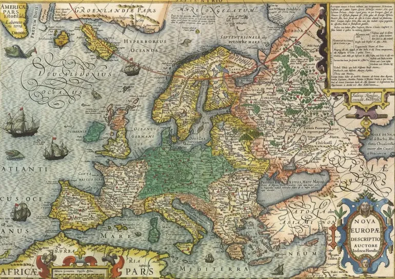 Europakarta i färg med gammaldags stil och med illustrationer av skepp och havsvarelser.