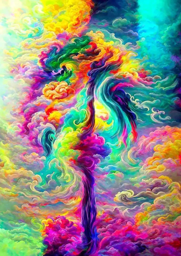 Något som liknar en lila pelare av rök stiger upp i ett böljande molntäcke, allt i regnbågens alla färger.