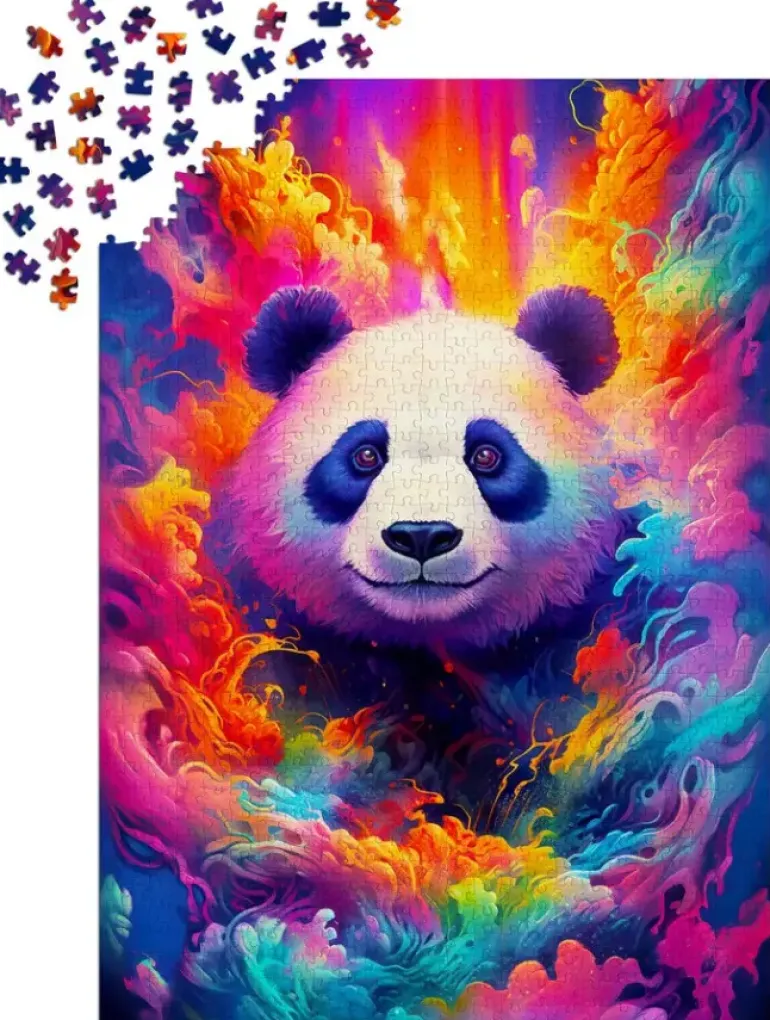 En panda sticker fram sitt huvud ur en kaskad av varma färger. Den riktar sin vänliga blick rakt mot pusslaren och man kan nästan skymta ett litet leende under den mjuka nosen.